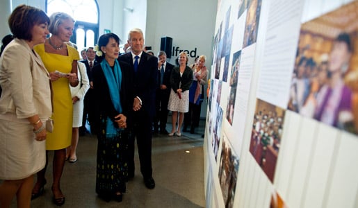 Aung San Suu Kyi views the exhibition "Mother Democracy" at the Nobel Peace Center. Director Bente Erichsen and exhibition manager Liv Astrid Sverdrup give a tour together with Thorbjørn Jagland, Chairman of the Norwegian Nobel Committee, on 16 June 2012.