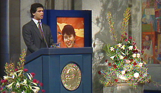 Aung San Suu Kyi's son Alexander Aris delivering the acceptance speech on behalf of his mother, at the Nobel Peace Prize Award Ceremony in Oslo, 10 December 1991. Aung San Suu Kyi was under house arrest and unable to receive the prize.