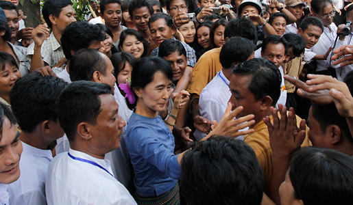 Aung San Suu Kyi meets with crowd after house arrest lift on 14 November 2010.