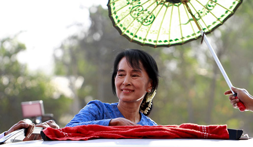 Aung San Suu Kyi arrives to give a speech to supporters during the 2012 by-election campaign at her constituency Kawhmu township, Myanmar, on 22 March 2012.