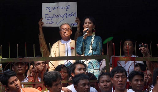 Aung San Suu Kyi gives a speech to supporters at Hlaing Thar Yar Township in Yangon, Myanmar on 17 November 2011.