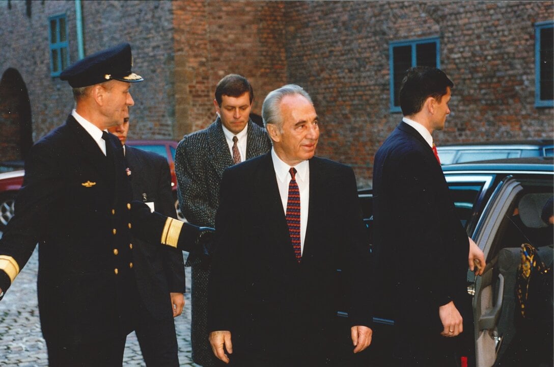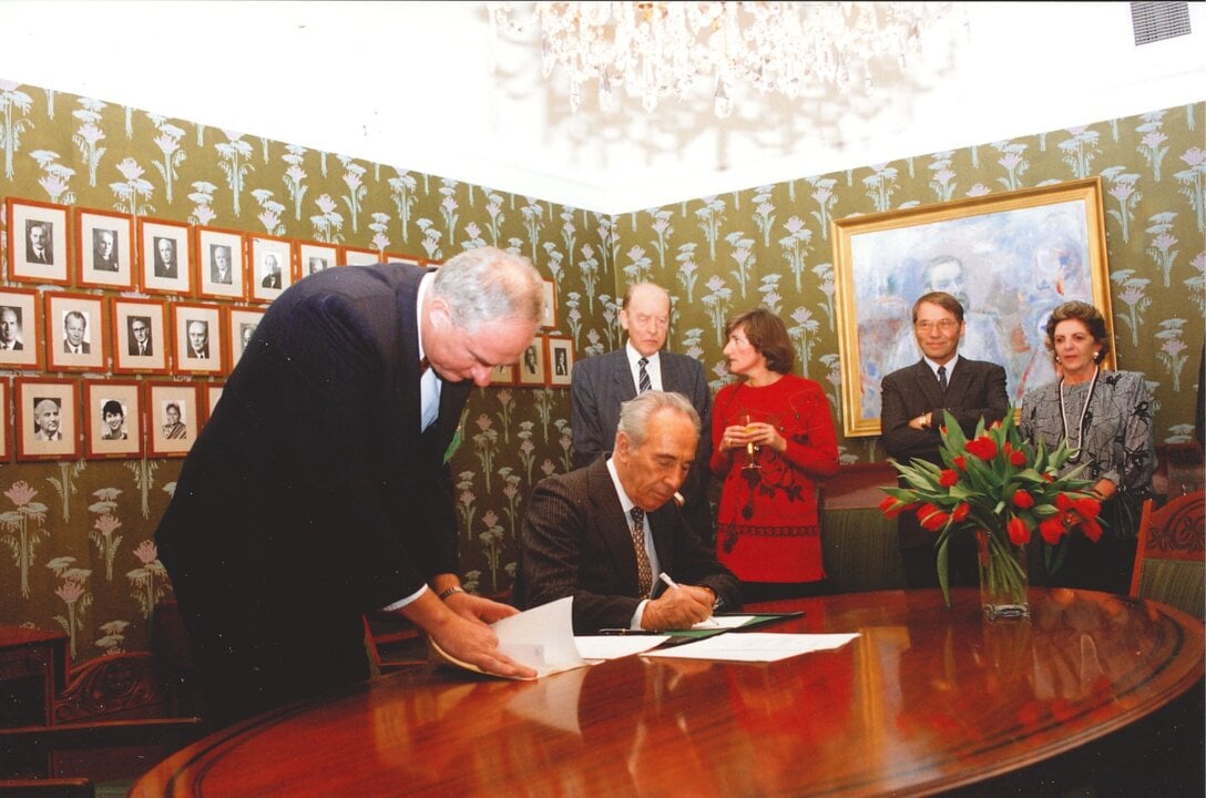 7 (of 8) Shimon Peres signing the guest book during his visit to the Norwegian Nobel Institute, December 1994.