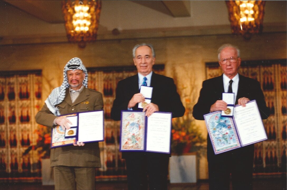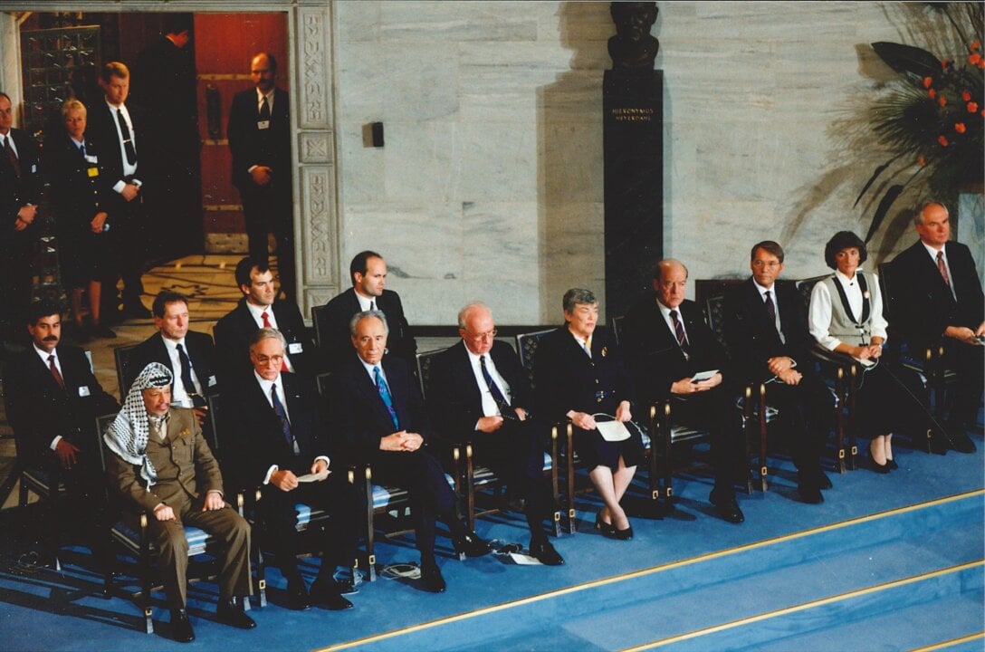 3 (of 8) From left: Yasser Arafat, Chairman of the Norwegian Nobel Committee Francis Sejersted, Shimon Peres and Yitzhak Rabin at the Nobel Peace Prize award ceremony at the Oslo City Hall in Norway, 10 December 1994.