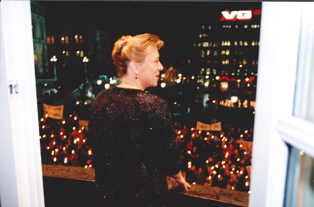 5 (of 13) Jody Williams viewing the traditional torch light procession in Oslo from a balcony at the Grand Hotel in Oslo, Norway, 10 December 1997.