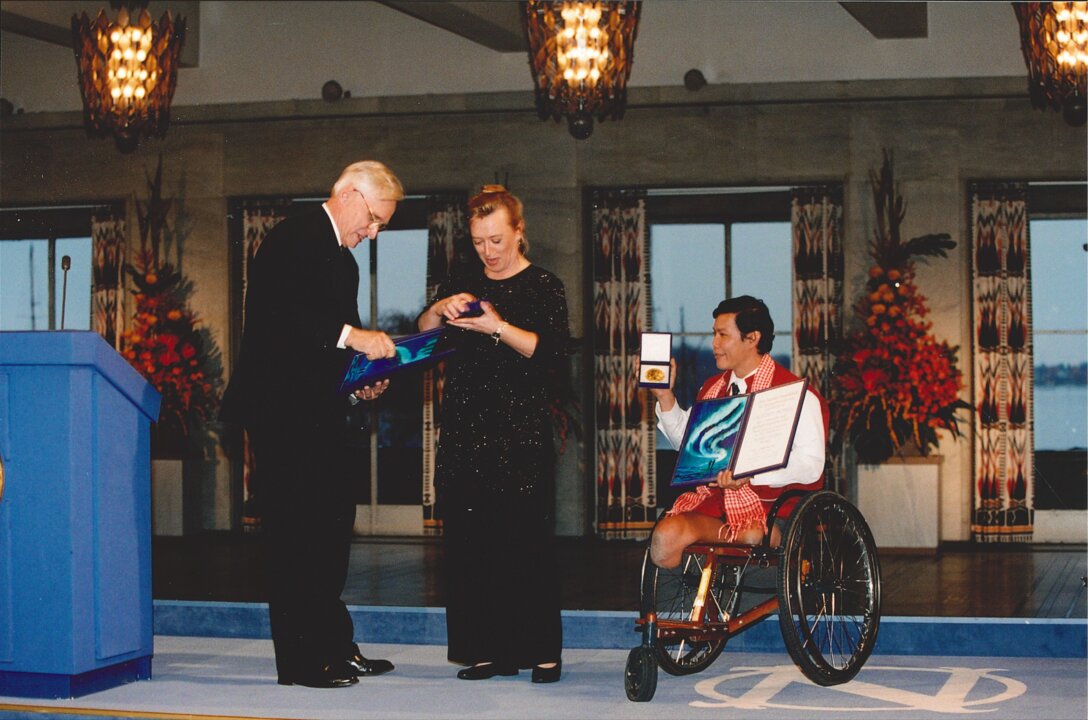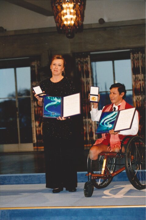 1 (of 13) Jody Williams and ICBL ambassador Tun Channereth showing their Nobel Prize medals and diplomas at the Nobel Peace Prize award ceremony at the Oslo City Hall in Norway, 10 December 1997.