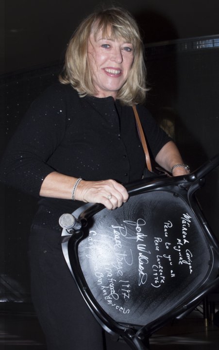 Jody Williams autographs a chair at Bistro Nobel at the Nobel Museum in Stockholm, 14 September 2013.