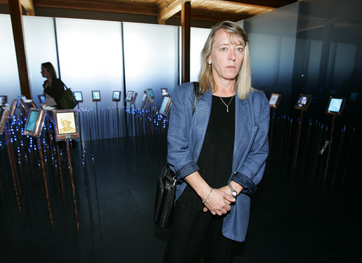 11 (of 13) Nobel Laureate Jody Williams in front of the exhibition of her Nobel Peace Prize awarded work during her visit to the Nobel Peace Center in June 2005.