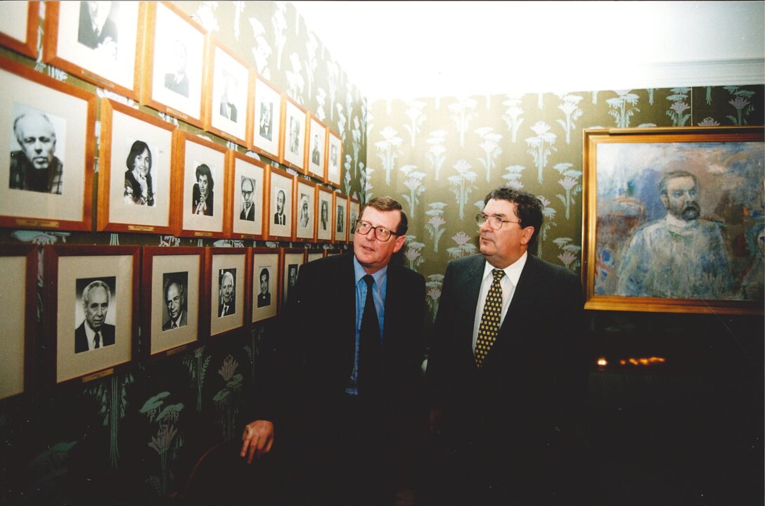 David Trimble and John Hume watching photos of previos peace laureates in the Committee room at the Norwegian Nobel Institute in Oslo, Norway, December 1998.