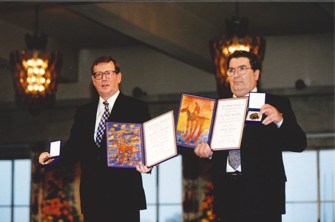 David Trimble and John Hume after receiving the Nobel Peace Prize medal and diploma at the award ceremony in Oslo on 10 December 1998.