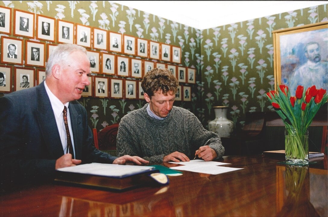 8 (of 10) James Orbinski, Médecins Sans Frontières, signing protocol and guest book during his visit to the Norwegian Nobel Institute, December 1999.
