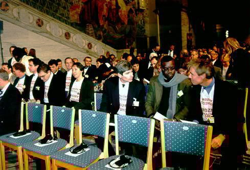 6 (of 10) Médecins Sans Frontières will "remain outspoken, passionate and deeply committed to its core principles," said its president, James Orbinski, in his Nobel Lecture at the Nobel Peace Prize Award Ceremony at the Oslo City Hall in Norway, 10 December 1999. Other Médecins Sans Frontières representatives underlined this message by wearing t-shirts to bring attention to the victims of the ongoing war in the breakaway Republic of Chechnya in Russia.