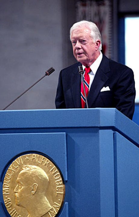 3 (of 8) Former U.S. President Jimmy Carter delivers his Nobel Lecture after receiving the 2002 Nobel Peace Prize in the Oslo City Hall, Oslo, Norway.