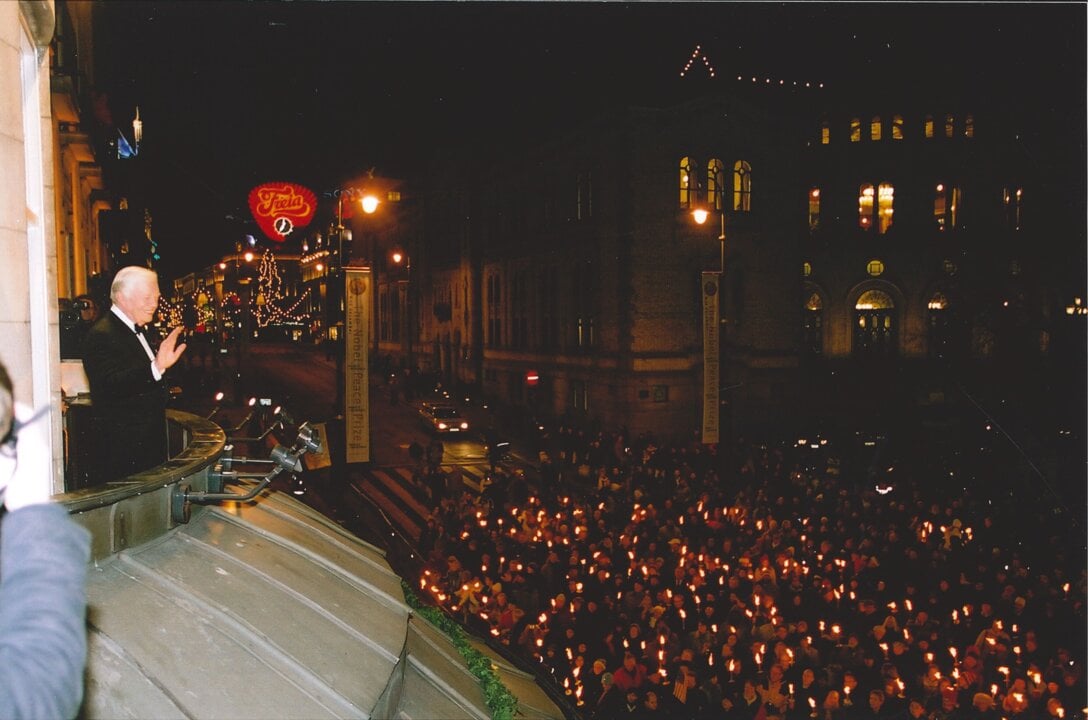 7 (of 8) Jimmy Carter viewing the traditional torch light procession in Oslo from a balcony at the Grand Hotel in Oslo, Norway, 10 December 2002.