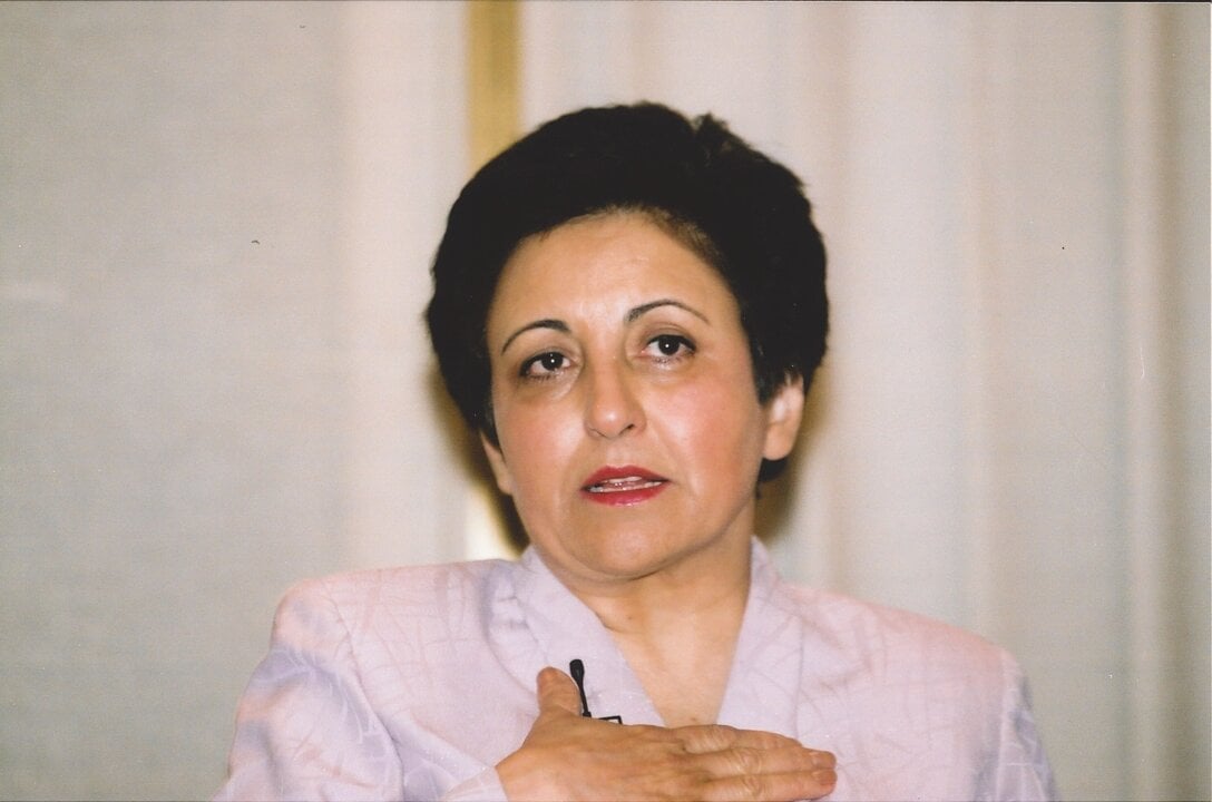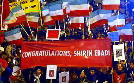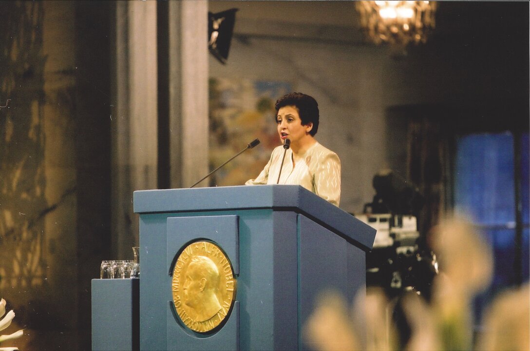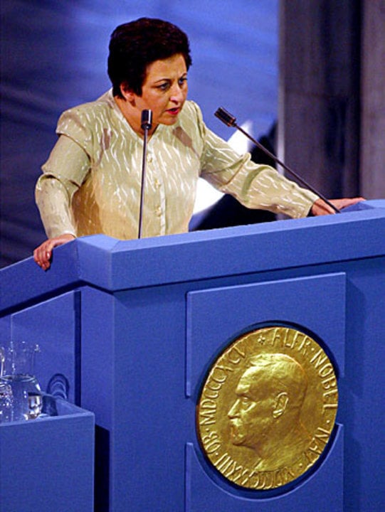 3 (of 14) Shirin Ebadi presenting her Nobel Lecture during the 2003 Nobel Peace Prize Award Ceremony in the Oslo City Hall. Shirin Ebadi accepted the prize on behalf of her fellow Iranians, Muslim women everywhere and those who struggle for human rights.
