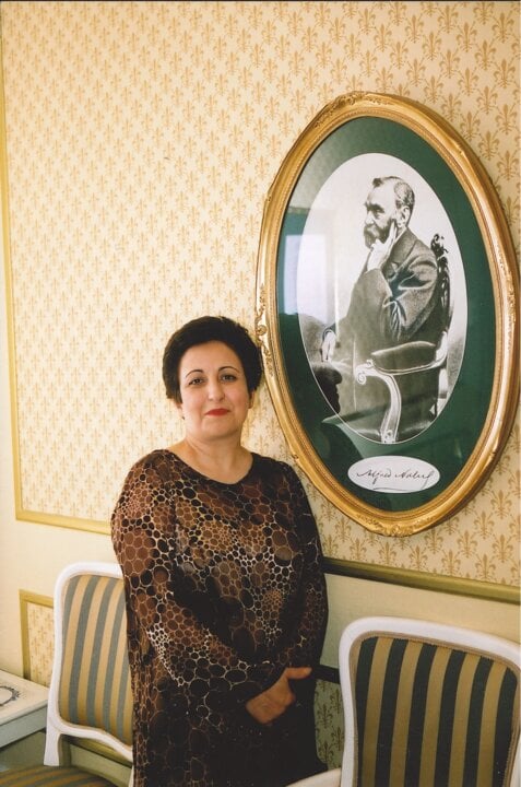 8 (of 14) Shirin Ebadi in front of a painting of Alfred Nobel in the Nobel suite of Grand Hotel, Oslo, Norway, December 2003.