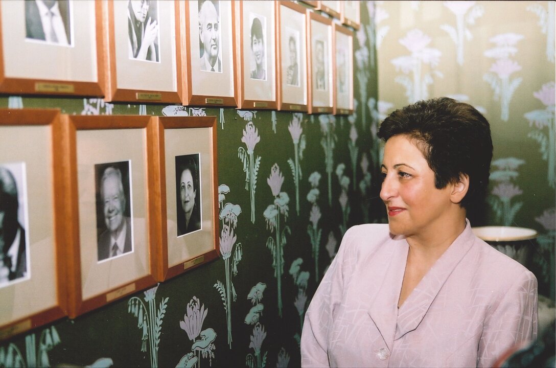 7 (of 14) Shirin Ebadi watching photos of previos peace laureates in the Committee room at the Norwegian Nobel Institute in Oslo, Norway, December 2003.