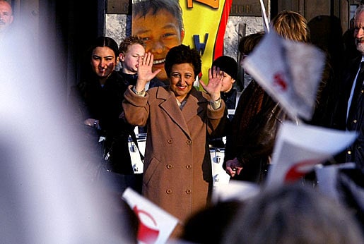 9 (of 14) Iranian human rights activist, Shirin Ebadi, waves to some 4,000 flag-waving children greeting her outside Oslo City Hall before the 2003 Nobel Peace Prize Award Ceremony on December 10.