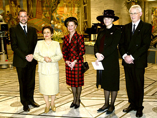 5 (of 14) Norway's Crown Prince Haakon, Nobel Laureate Shirin Ebadi, Queen Sonja of Norway, Crown Princess Mette-Marit, and Chairman of the Norwegian Nobel Committee Ole Danbolt Mjøs in the Oslo City Hall.