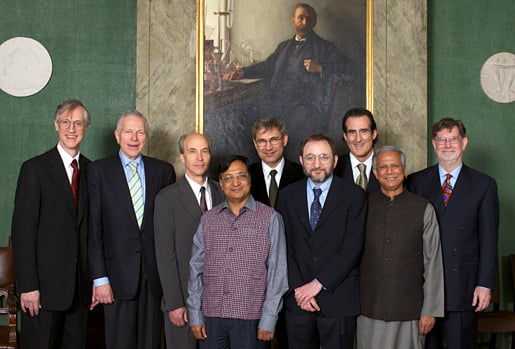 All the 2006 Nobel Laureates assembled for a group photo during their visit to the Nobel Foundation, 12 December 2006. Left to right: John C. Mather, Edmund S. Phelps, Roger Kornberg, Dipal Chandra Barua (representing Grameen Bank), Orhan Pamuk, Andrew Z. Fire, Craig C. Mello, Muhammad Yunus, and George F. Smoot.