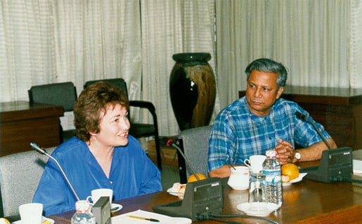 Mairead Corrigan Maguire, 1976 Nobel Peace Prize Laureate, visiting Grameen Bank and Muhammad Yunus on 23 November 1998.