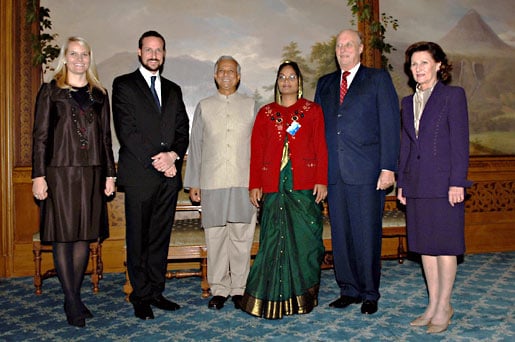 Crown Princess Mette-Marit and Crown Prince Haakon of Norway, Nobel Peace Prize Laureate Muhammad Yunus, Mosammat Taslima Begum (representing Grameen Bank), and Their Majesties King Harald V and Queen Sonja of Norway at Oslo City Hall, 10 December 2006.