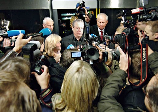 Al Gore meets the journalists. To his left, Ole Danbolt Mjøs, Chairman of the Norwegian Nobel Committee. To his right, Geir Lundestad, Secretary of the Norwegian Nobel Committee.