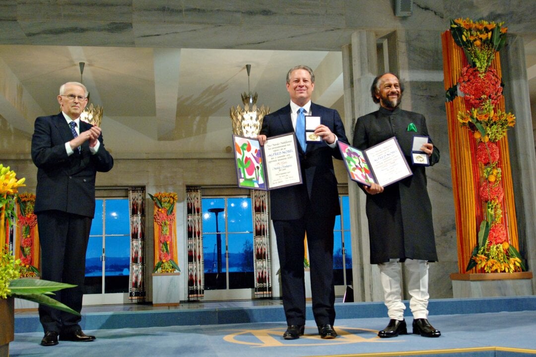 Nobel Peace Prize laureates Al Gore (middle) and Rajendra K. Pachauri, Chairman of the Intergovernmental Panel on Climate Change (IPCC) with their Nobel Peace Prize medals and diplomas at the award ceremony in Oslo, Norway, 10 December 2007. To the far left is Ole Danbolt Mjøs, Chairman of the Norwegian Nobel Committee.