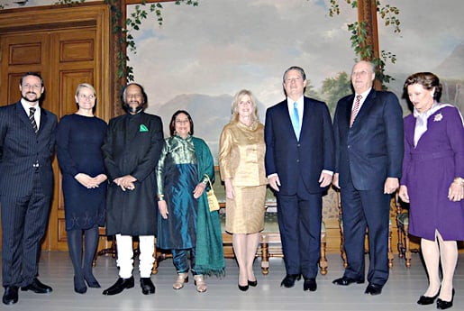 The 2007 Nobel Peace Prize Laureates and their spouses with the Norwegian Royal Family at the Royal Palace in Oslo, Norway (from left to right): Their Royal Highnesses Crown Prince Haakon and Crown Princess Mette-Marit of Norway, Rajendra K. Pachauri, Saroj Pachauri, Tipper Gore, Al Gore, and Their Majesties King Harald V and Queen Sonja of Norway.
