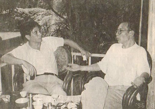 5 (of 7) Liu Xiaobo (right) and Wang Xizhe (left) during a meeting at Orchid Garden, Guangzhou, exchanging their views on some of the current major state affairs. They later agreed to write the October Tenth Declaration to both the Communist Party of China (CPC) and the Chinese Nationalist Party (Kuomintang). Photo taken 11 August 1996.