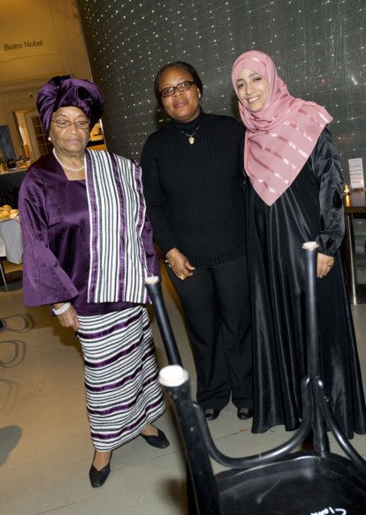 5 (of 9) Nobel Peace Prize Laureates Ellen Johnson Sirleaf, Leymah Gbowee and Tawakkol Karman during their visit to the Nobel Museum in Stockholm, 12 December 2011.