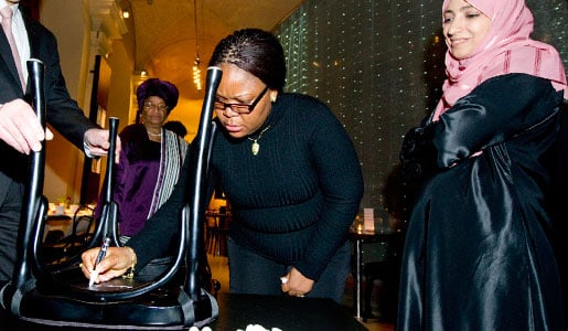 4 (of 9) Leymah Gbowee autographs a chair at Bistro Nobel at the Nobel Museum in Stockholm, 12 December 2011.