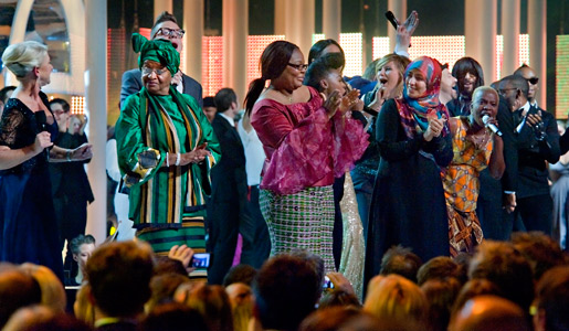 From left: Host Helen Mirren, Nobel Peace Prize Laureates Ellen Johnson Sirleaf, Leymah Gbowee and Tawakkol Karman, and artist Angélique Kidjo at the Nobel Peace Prize Concert at the Oslo Spektrum Arena on 11 December 2011.