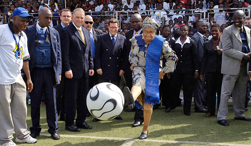 Ellen Johnson Sirleaf, kicks a soccer ball to start of a "Sport for Peace" tournament, aimed at encouraging Liberians to embrace and use sport in promoting peace. Photo taken in Monrovia, Liberia, 2007.
