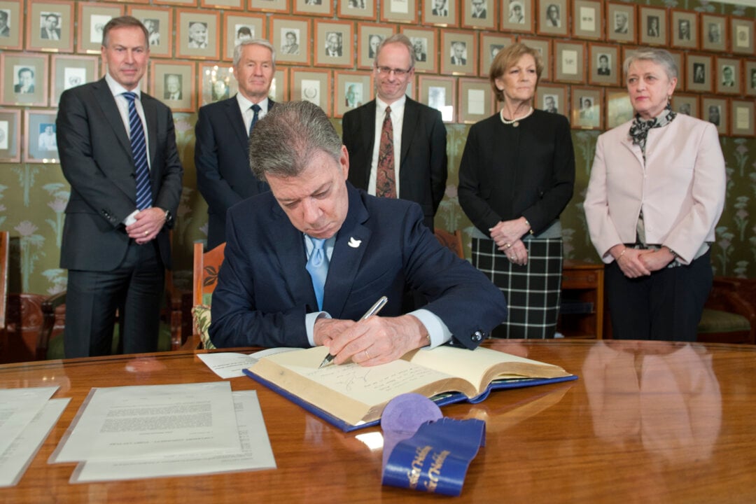 8 (of 9) Juan Manuel Santos signing the guestbook at the Norwegian Nobel Institute in front of the Norwegian Nobel Committee, December 2016.