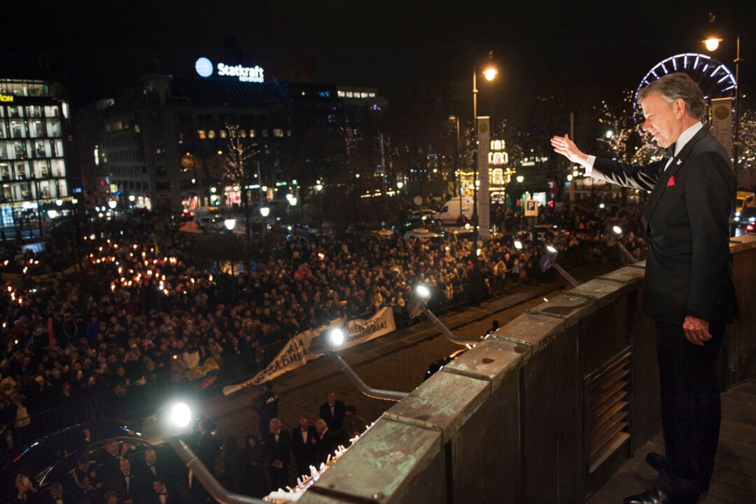 4 (of 9) Juan Manuel Santos greets the torchlight procession from a balcony at the Grand Hotel in Oslo, Norway, 10 December 2016.
