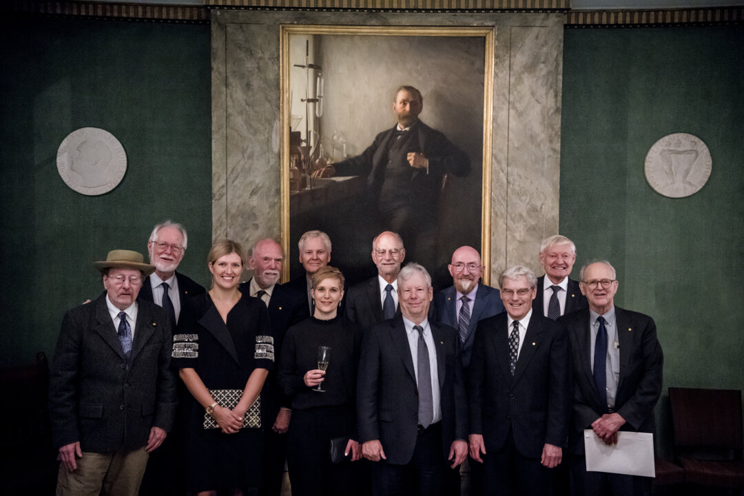 2017 laureates assembled at the Nobel Foundation during Nobel Week on 12 December 2017. Back row: chemistry laureate Jacques Dubochet, physics laureate Barry C. Barish medicine laureates Michael W. Young and Michael Rosbash, physics laureate Kip S. Thorne and chemistry laureate Joachim Frank. Front row: medicine laureate Jeffrey C. Hall, representatives of peace laureate ICAN Beatrice Fihn and Josefin Lind, Richard H. Thaler, chemistry laureate Richard Henderson and physics laureate Rainer Weiss.