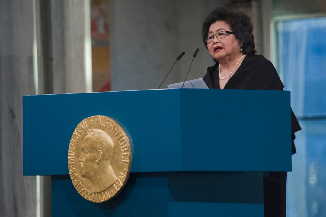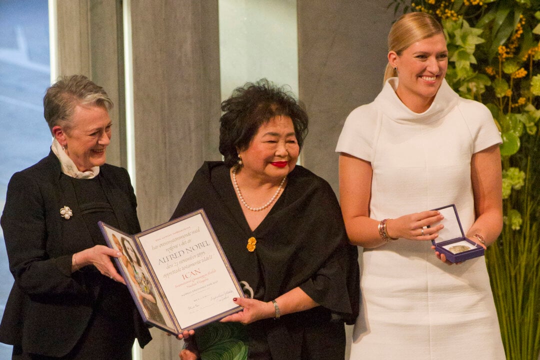 ICAN, represented by Setsuko Thurlow and Beatrice Fihn, receive the Nobel Peace Prize medal and diploma from Berit Reiss-Andersen of the Norwegian Nobel Committee, during the award ceremony in Oslo on 10 December 2017.