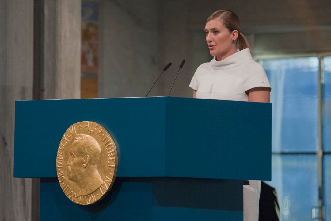 Executive director of ICAN Beatrice Fihn delivering her Nobel Peace Prize lecture at the Oslo City Hall in Norway, 10 December 2017.