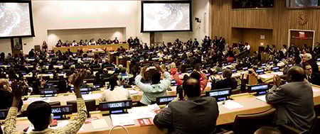 Moment of treaty adoption on 7 July 2017, when an overwhelming majority of the world's nations adopted a landmark global agreement to ban nuclear weapons.