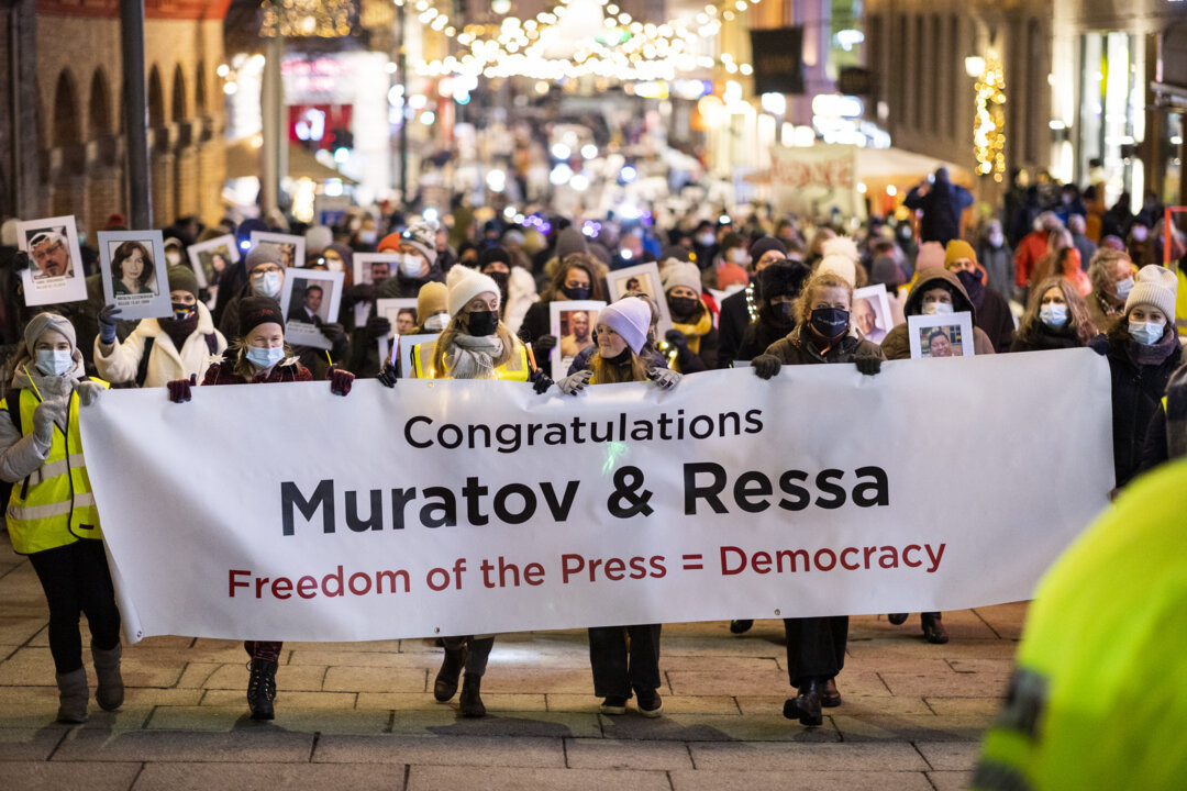 6 (of 9) The traditional torchlight parade in the streets of Olso, Norway, greeting the 2021 peace laureates, Maria Ressa and Dmitry Muratov, 10 December 2021.