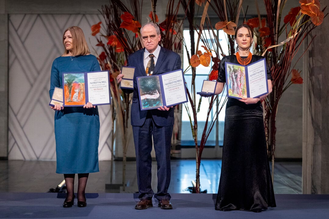 1 (of 6) Representatives of the Nobel Peace Prize laureates for 2022 with their medals and diplomas. Ales Bialiatski, represented by Natallia Pinchuk, Memorial, represented by Jan Rachinsky and Center for Civil Liberties, represented by Oleksandra Matviichuk.