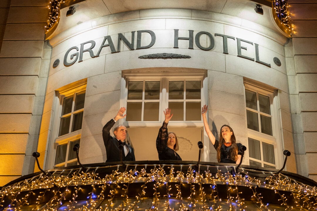 4 (of 6) Representatives of the Nobel Peace Prize laureates for 2022 Jan Rachinsky, Natallia Pinchuk and Oleksandra Matviichuk viewing the traditional torch light procession in Oslo from a balcony at the Grand Hotel in Oslo, Norway, 10 December 2022.