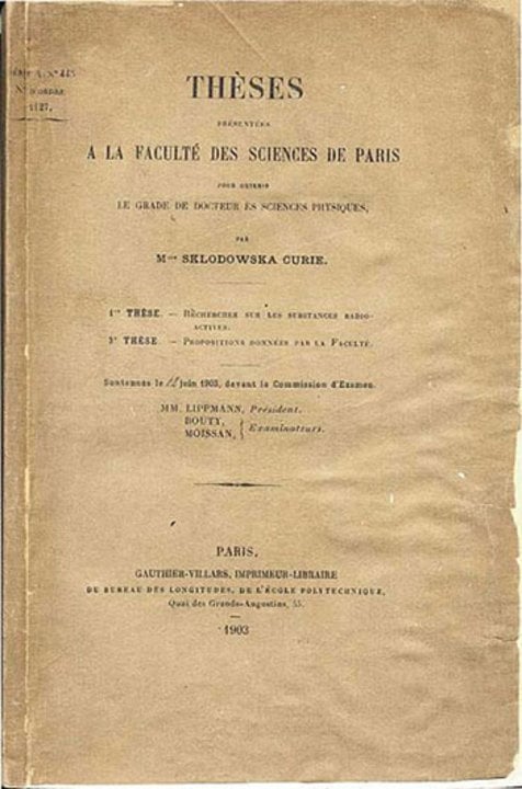 On 25 June 1903 Marie Curie defended her doctoral thesis on radioactive substances at Université de la Sorbonne in Paris, thus becoming the first woman in France to receive a doctoral degree. Image shows the thesis cover: Recherches sur les substances radioactives (Research on Radioactive Substances).