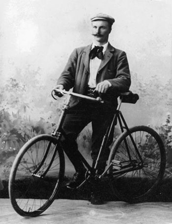 1 (of 3) Gustaf Dalén and his bicycle in a studio photo from 1895. The bike was at the time Gustaf Dalén's favourite object, and he saw a great potential for its technical development and improvement, for example the brake mechanics.
