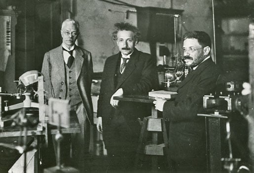 3 (of 11) Three Nobel Laureates in Physics standing in front of the Athenaeum at California Institute of Technology (Caltech), 1931. Front row from left: Albert A. Michelson, Albert Einstein and Robert A. Millikan.