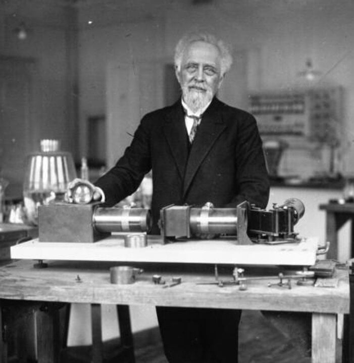 1 (of 1) French physicist Jean Perrin with his mega-spectroscope at the Institut Curie, 1927.