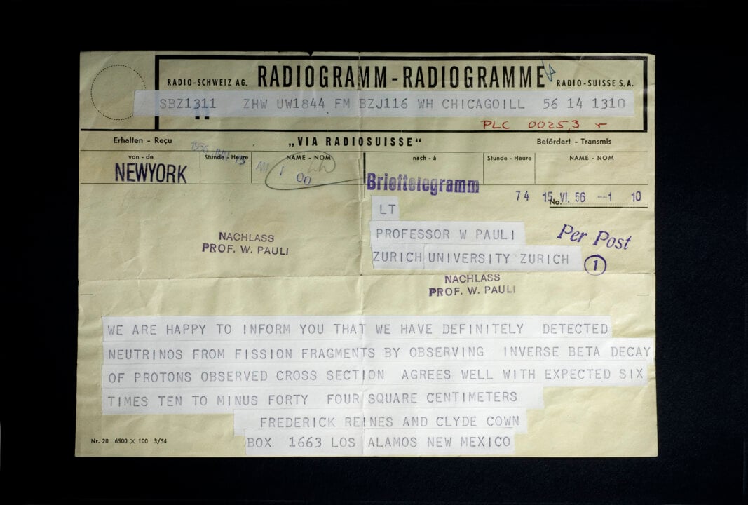 2 (of 5) Telegramme sent on June 14 1956 from physicists Fred Reines and Clyde Cowan to Wolfgang Pauli announcing the detection, for the first time, of neutrinos. The Nobel Prize in Physics 1995 was awarded to Reines for this discovery.