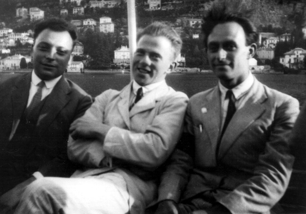 3 (of 5) The three physics laureates Wolfgang Pauli, Werner Heisenberg and Enrico Fermi on a boat on Lake Como, Italy, in September 1927 .