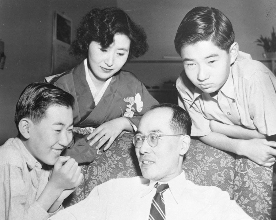 1 (of 1) Hideki Yukawa with his wife Sumiko and two sons Harumi and Takaaki. Photo taken in November 1949.