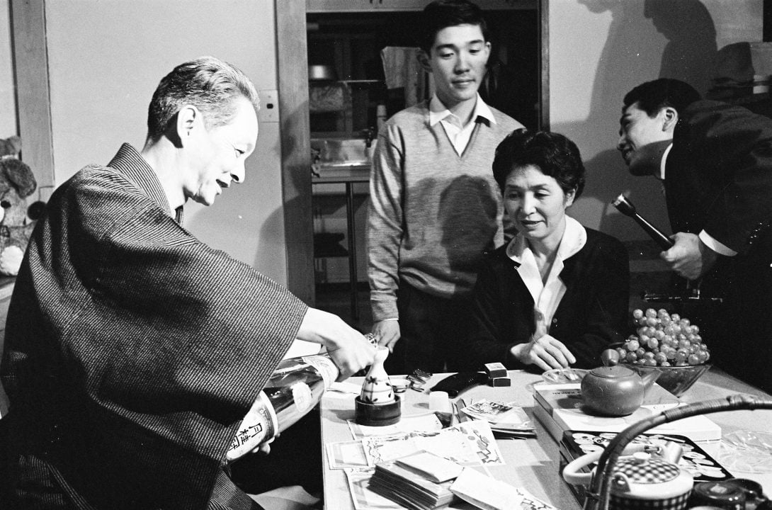 1 (of 1) Sin-Itiro Tomonaga pours sake after hearing the news of being awarded the Nobel Prize in Physics, October 1965 in Tokyo, Japan.